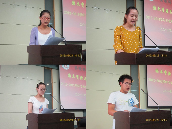 首先,院长焦华富宣读了《关于表彰2010级旅游管理、土地资源管理第一批专业实习优秀小组、优秀个人和优秀案例的决定》,授予深圳圣庭院大酒店实习小组、绍兴开元名都大酒店实习小组、南京国图信息产业股份有限公司实习小组“优秀实习小组”称号;授予吕珂、徐柯等9人“优秀实习生”称号;郭汪宝等13名同学撰写的实习案例被评为“优秀实习案例”。随后,来自10级的4名优秀实习小组及优秀实习生代表分别作了发言。他们通过引人入胜的自我展示,讲述了实习期间难忘的工作经历和艰辛的成长历程。他们均表示,本次顶岗实习,提升了专业技能水平,提高了自身的心理素质,对思考今后的人生、规划自己的未来奠定了更坚实的基础。之后,党委副书记罗振对本次实习做了组织管理的全面总结,重申了学院实习工作领导小组的各项工作和部署。此外,对同学们所取得的成绩进行肯定和表扬并由各位领导老师向获奖学生颁发荣誉证书。