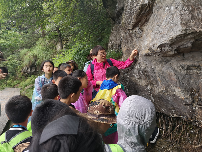 飞来石位于西谷上端,似天外飞来,因而得名。然而冰川遗迹的说法存疑,仍需考究。山中曲径通幽,步于如琴湖岸边,望着静谧如画的湖面,老师对水质进行判断的同时,提问“水从何来?”“湖怎样形成?”,发人深省并详细解释。“人间四月芳菲尽,山寺桃花始盛开。”花径公园繁花似锦,艳丽如春,令人欲罢不能。来到月照松林处,罗盘仪的出现,勾起了学员们的好奇心和探索知识的欲望,纷纷动起手来测量产状。一路走来,路上所见景观地质地貌,如剪刀峡、望江亭与仙人涧等,其成因都得到了科学的解释。