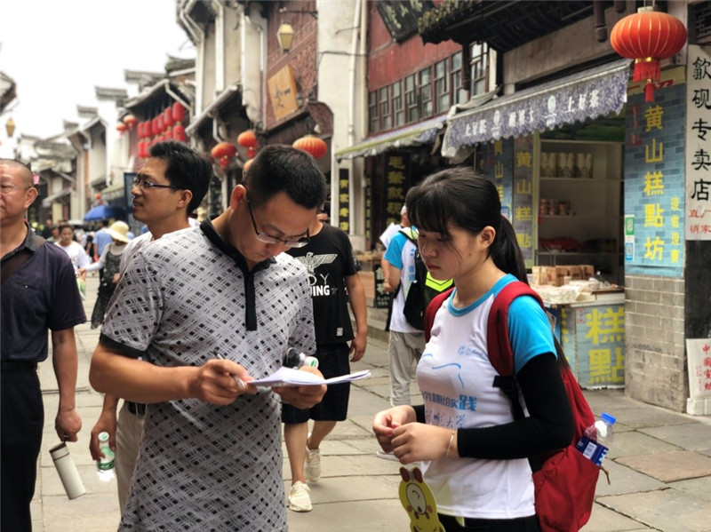 作为有深厚文化底蕴的历史街区,老街集聚了来自全国各地的游客,为本次问卷调查提供了足够典型的样本。同时,经过历史的变迁和岁月的洗礼,老街俨然从历史古街转化为了如今黄山重要的旅游商业聚集地,街上不乏出售黄山烧饼、茶叶、糕点等黄山特产的商家。这有利于队员们针对当地各类不同商家的视角,进行具有商业营销和当地住民并行性质的文明旅游知识的问卷调查。本次老街的调查,目的在于从不同人的角度了解当地的旅游现状,同时也能以旅游中各种不文明现象对环境危害为实例,向游客们宣传更有效的旅游文明准则。
