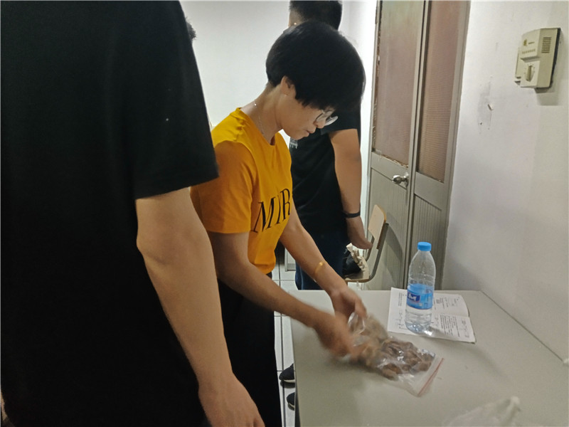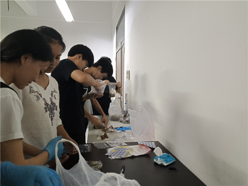 指导老师徐仪红表示,此次采集的样本数量不多,用四分法操作会导致最后的样本过少,不符合后期的实验处理的要求,因此只做简单的分类。徐仪红强调,在分类上只需分出一部分做为实验样本,大概300克左右,剩下的作为备份样本重新装袋并做好相应标记。全体队员认真听讲、详细记录,按指导老师要求有序展开对样本的分类工作。分类的过程中,一些同学在细节上存有疑惑,徐仪红都立即给出了相应的解释和指导。