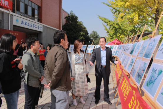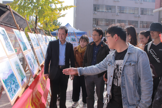 下午1时,学院领导及老师们来到现场,同学们热情地围上去给老师们讲解自己的作品,宏村写生的带队老师鲍涛也从专业的角度向领导老师们讲解每幅画的风格和亮点。面对一幅幅精彩的画作,乔静、杨兴柱对同学们赞不绝口。