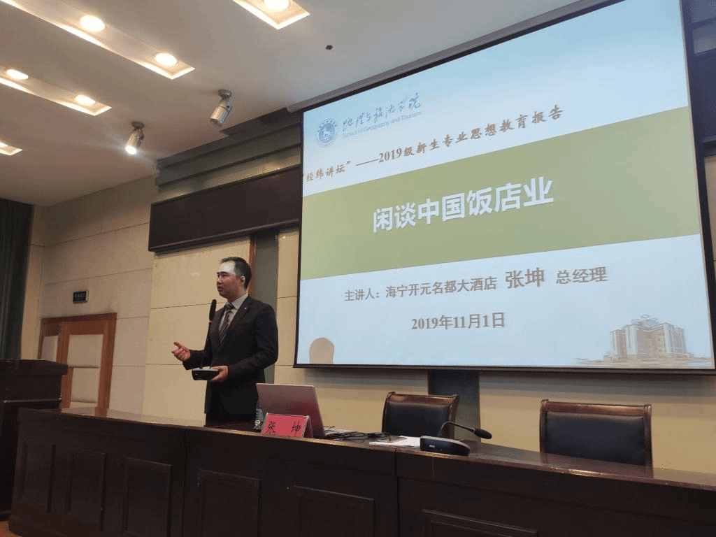 本网讯(565net必赢客户端 梅雪意 徐倩)2019年11月1日,565net必赢客户端2019级旅游管理类专业举办“经纬讲坛”—2019级新生专业思想教育报告:旅游饭店业的发展及现状专题报告。2004届旅游管理专业优秀校友张坤(现任海宁开元名都大酒店总经理)重返母校,就旅游饭店业的发展及现状,为2019级旅游管理类专业学弟学妹们上了生动而精彩的一课。