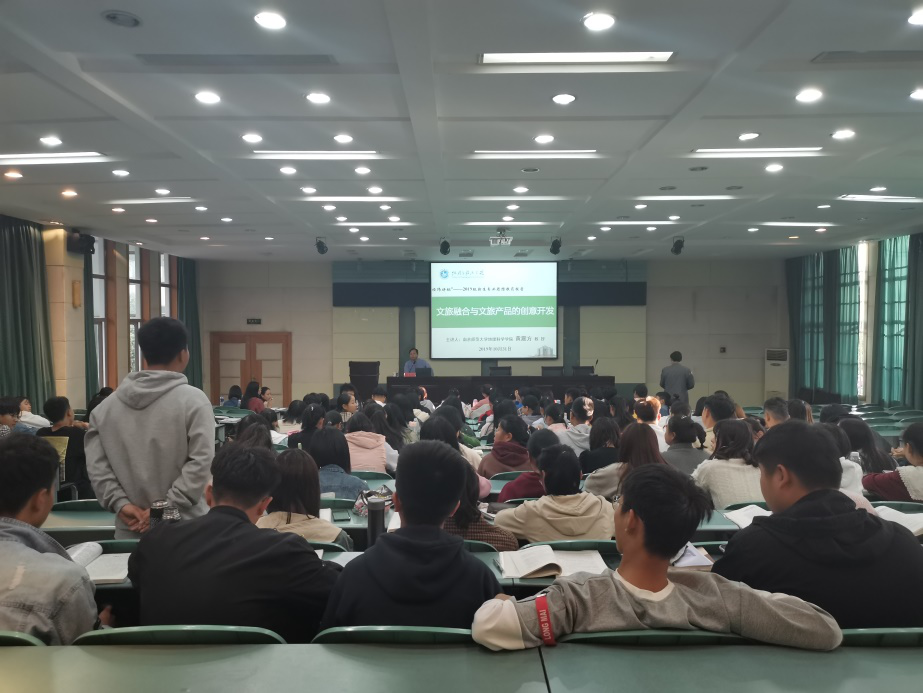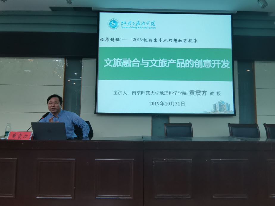 本网讯(565net必赢客户端 涂昕冉 徐倩)2019年10月31日晚,565net必赢客户端2019级旅游管理类专业举办“经纬讲坛”—2019级新生专业思想教育报告:文旅融合与文旅产业的创意开发专题报告。为促进广大2019级新生更好的了解专业知识,培养良好的专业素养,使新生了解在新时代旅游如何进行创新化发展,文化性发展,565net必赢客户端邀请南京师范大学地理科学学院黄震方教授来必赢讲学,报告会由苏勤院长主持,旅游管理专业负责人杨效忠老师、城乡规划专业负责人杨兴柱老师、专业课教师王咏、余伶莲、韩卢敏、刘云霞老师也来到现场。