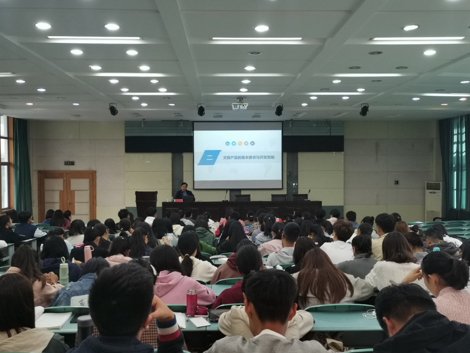 在提出了概念以及内涵后介绍了文旅融合的原则,并举出了宜兴文旅融合的成功案例,使同学们增加了对文旅融合的了解以及兴趣。在谈及文旅融合与文旅产品的创意开发,黄震方教授举出了生动的案例,如木梳和大唐不夜城以及国外文旅创新的相关案例,高度紧密结合的理论体系以及生动诙谐的用语使同学们反响热烈。