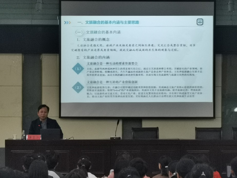 黄震方教授是南京师范大学地理科学学院教授、博士生导师,南京师范大学旅游管理学科带头人。报告会上,黄震方教授围绕主题讲述了文旅融合的基本内涵与主要思想,文旅产品的基本要求与开发策略,主要文旅产品的创意开发与成功案例三部分。
