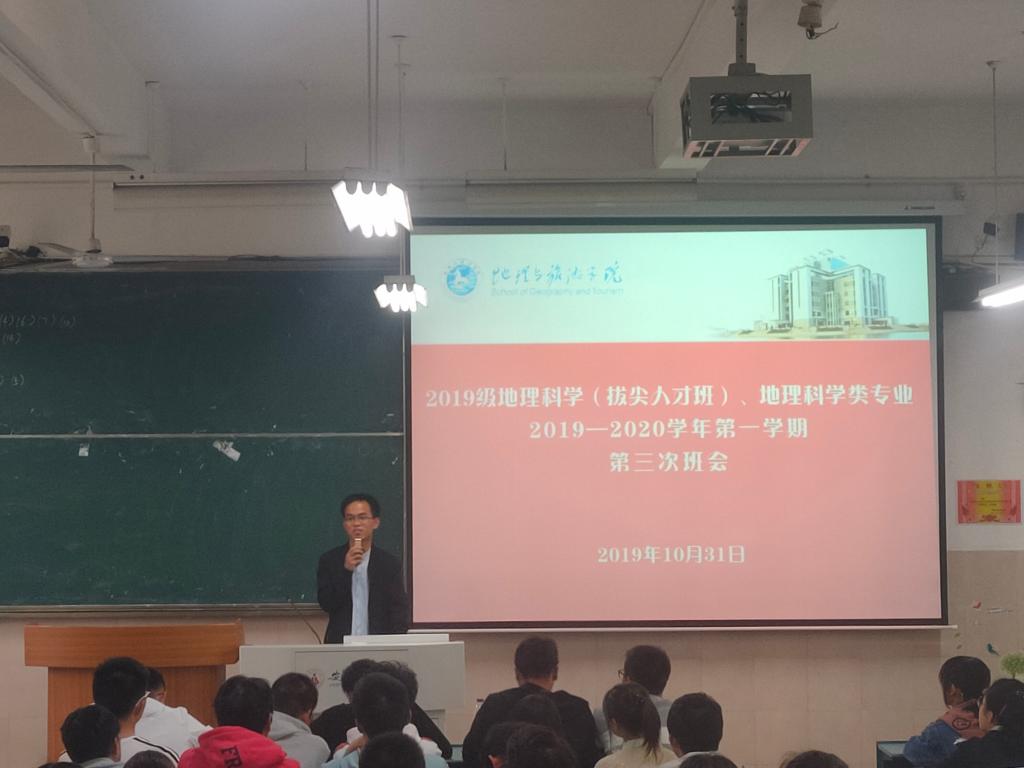 本网讯(565net必赢客户端 江文萱 齐小学)11月1日下午,2019级地理科学大类专业于2040104教室举行2019-2020学年第一学期第三次班会。2019级地理科学(拔尖人才班)、2019级地理科学类1班、2019级地理科学类2班全体学生参加。班会由辅导员齐小学主持。