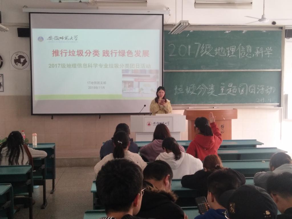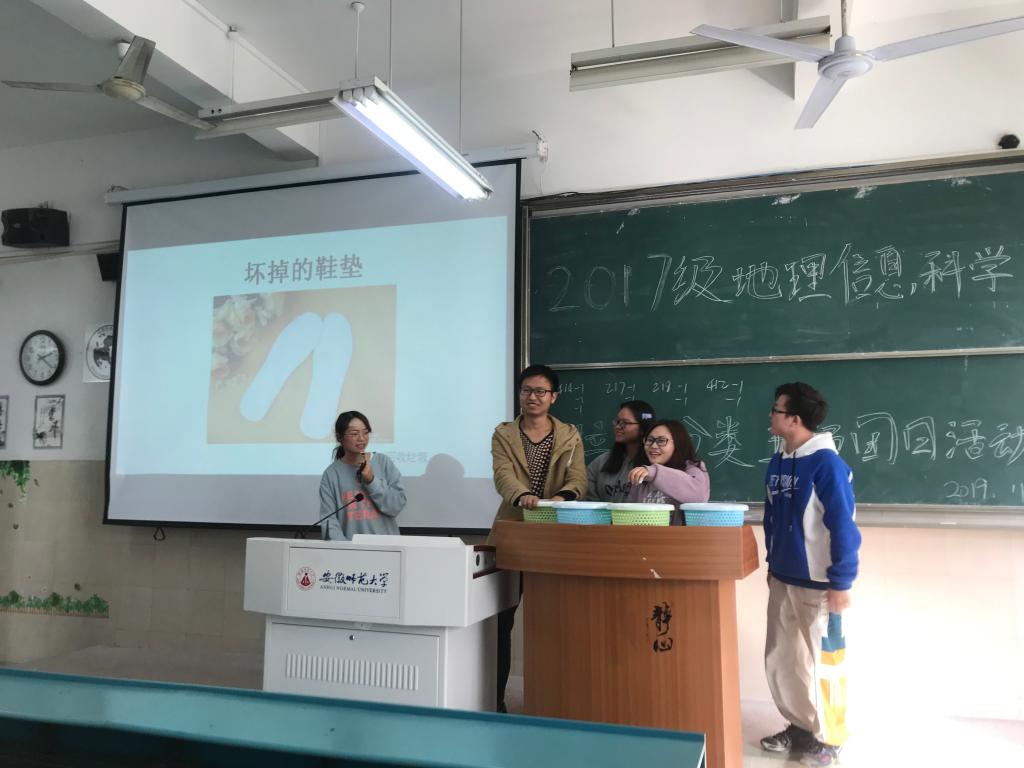 本网讯(565net必赢客户端 章莹莹)为了推行垃圾分类,提高同学们的环保意识,2017级地理信息科学专业于11月21日下午14点在行知楼2040201组织召开了“推行垃圾分类,践行绿色发展”的垃圾分类主题团日活动。会议由团支书谢煜欣主持,该班级全体同学参与。