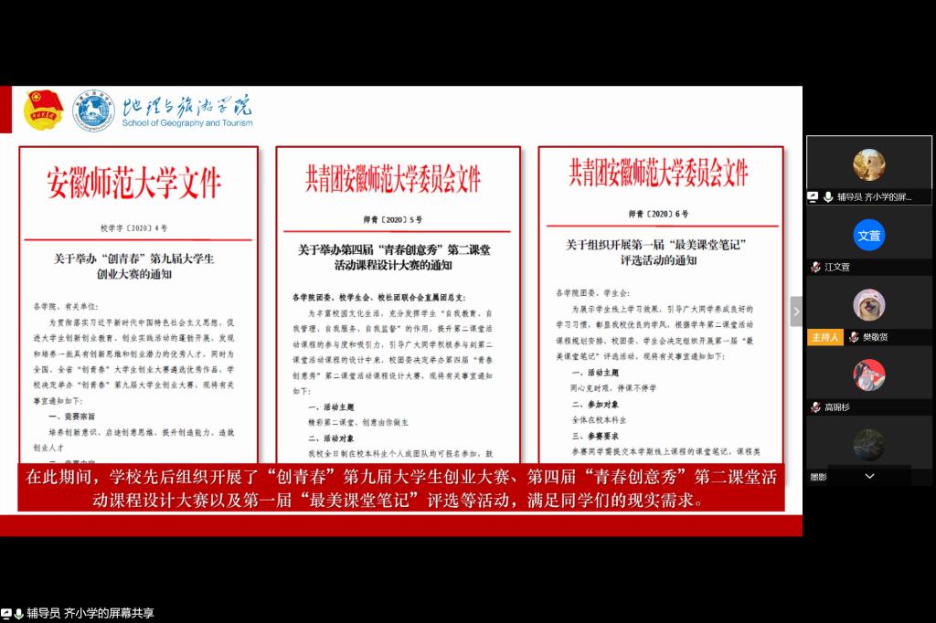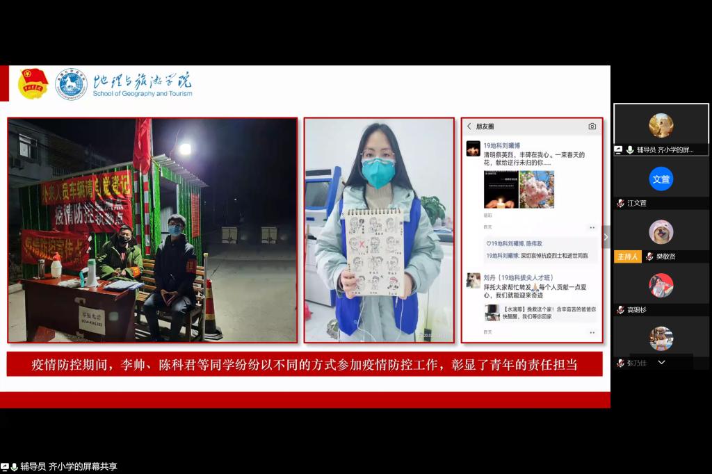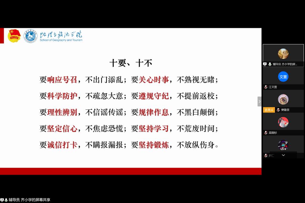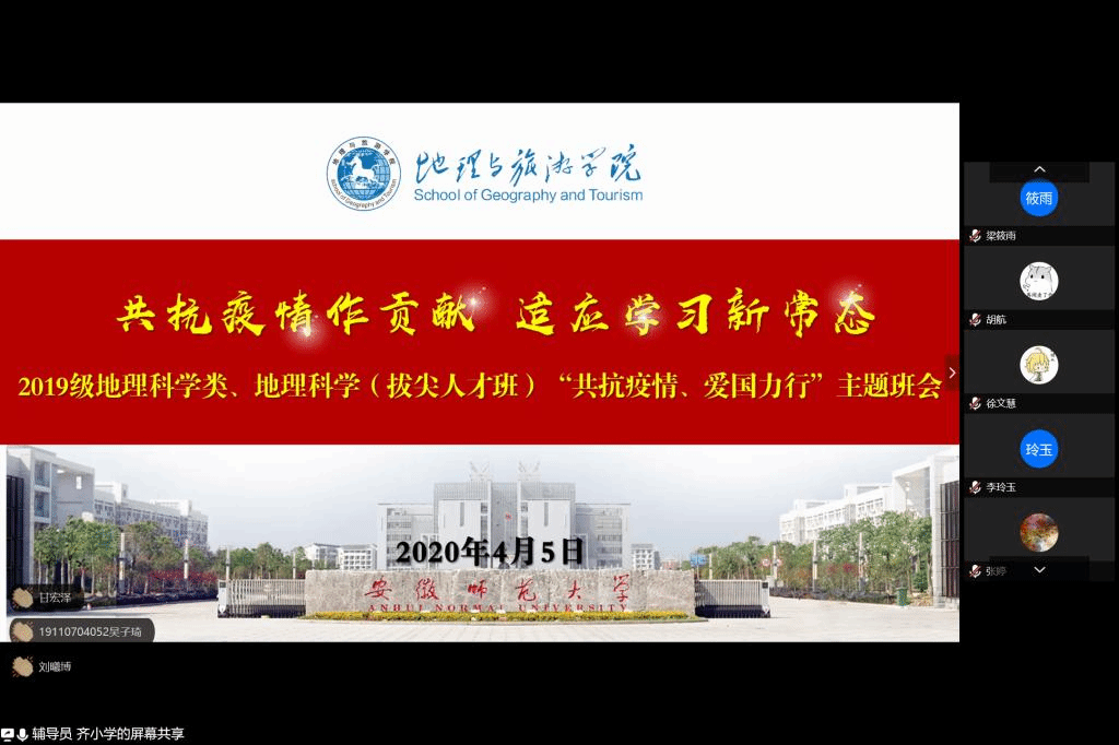 本网讯(565net必赢客户端 高诗涵 齐小学)为贯彻落实疫情防控工作最新通知和学校线上教学相关要求,教育引导同学们适应线上教学新常态。4月5日晚,2019级地理科学大类积极运用腾讯会议网络平台组织召开了“共抗疫情、爱国力行”网络主题班会。2019级地理科学类、地理科学(拔尖人才班)全体同学参加班会。班会由辅导员齐小学主持。