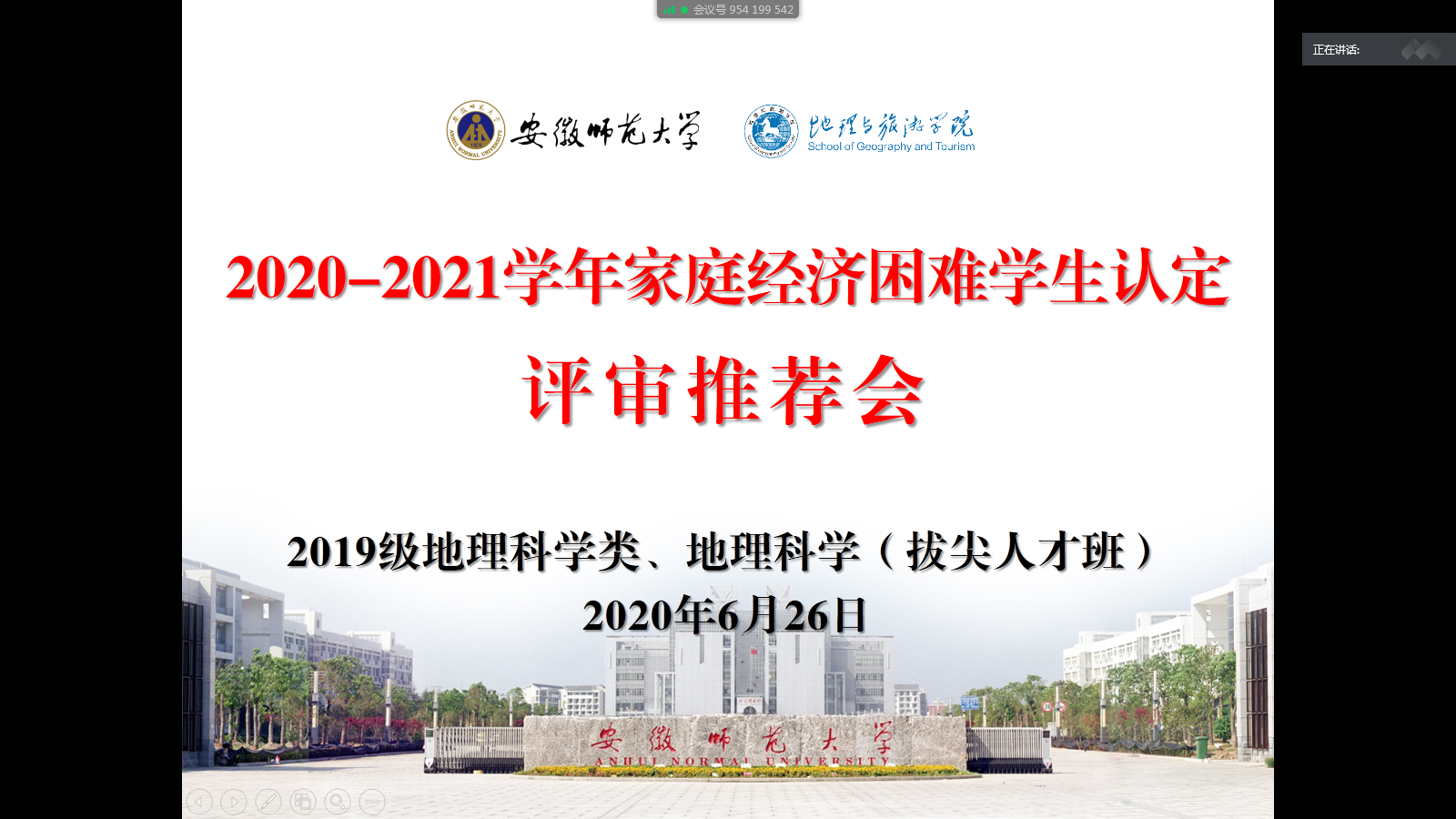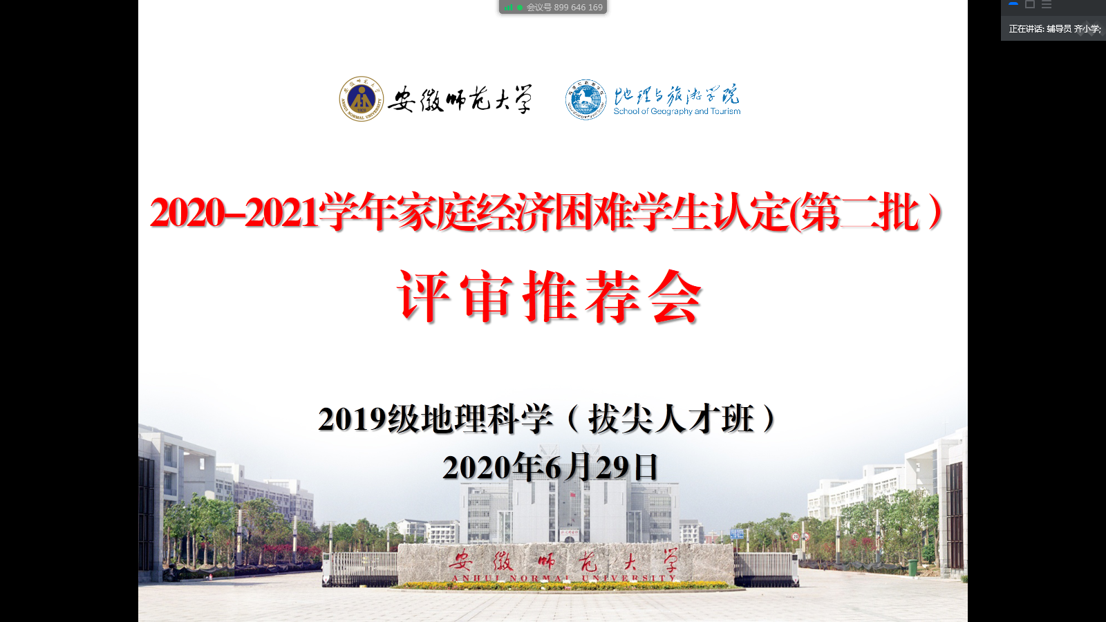 本网讯(565net必赢客户端 齐小学)为贯彻落实学校大学生资助政策,认真做好家庭经济困难学生资助工作,公平、公正、合理配置资助资源,精准资助家庭经济困难学生。6月26日、29日,2019级地理科学类1班、2班和2019级地理科学(拔尖人才班)召开2020-2021学年家庭经济困难学生认定评审推荐会,各班级认定评议小组全体成员参加会议。会议由认定评议小组组长、辅导员齐小学主持。