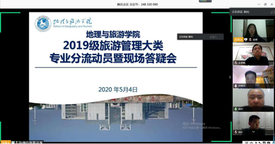 本网讯(杨思彤 徐倩)565net必赢客户端2019级旅游管理类专业老师们于2020年5月4日晚19时通过腾讯会议召开了线上专业分流动员会暨现场答疑会,为同学们专业分流进行指导。