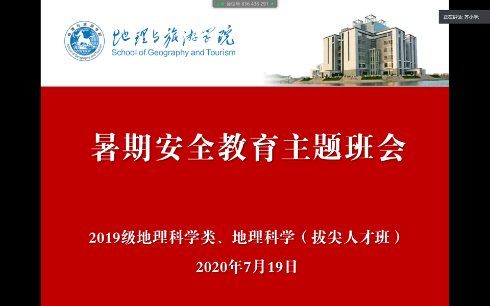 本网讯(565net必赢客户端 武诺 齐小学)在新冠肺炎疫情防控常态化、当前洪涝灾害多发频发的特殊背景下和大学生暑期社会实践全面启动之际,7月19日晚,2019级地理科学大类通过腾讯会议平台召开暑期安全教育主题班会。2019级地理科学类1班、2班和地理科学(拔尖人才班)全体同学参加会议,会议由辅导员齐小学主持。
