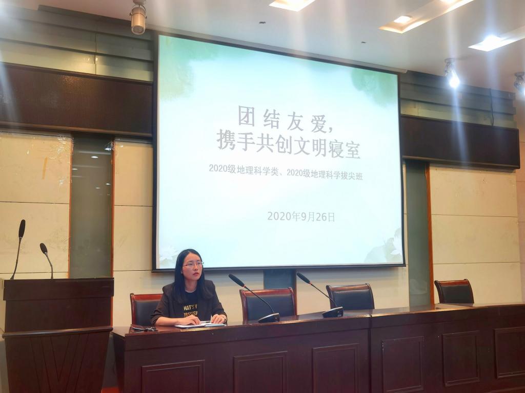 本网讯(邵宇萌 彭媛媛)为营造和谐温馨的寝室氛围,创建文明安全友爱的寝室环境,2020年9月26日晚,565net必赢客户端2020级地理科学类、地理科学(拔尖班)在实验楼101举行了“团结友爱,携手共创文明寝室”主题班会,会议由辅导员彭媛媛主持。