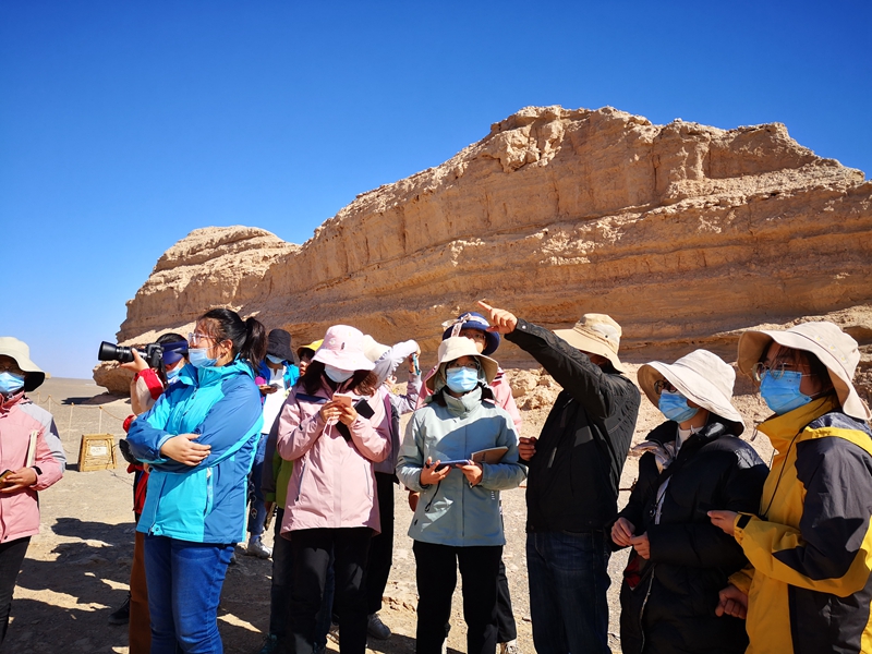 仅仅是考察玉门关一处的古环境,不免有些以偏概全,因此团队全体成员于10月14日下午前往雅丹地质国家公园,以考察雅丹地貌的成因及其古环境指示意义,通过观察中国极端干旱区的地理环境条件进一步分析古环境与地质、水文等方面之间的相互影响。根据程先富对雅丹地貌的详细讲解以及对相关知识的回顾,同学们明确了雅丹地质公园岩性松散,主要由泥岩、粉砂岩构成,水动力条件的不同也会影响构成雅丹地貌的粒径大小和层理走向。这进一步加深了同学们对古环境指示意义的理解,提高了同学们以今辨古的能力。