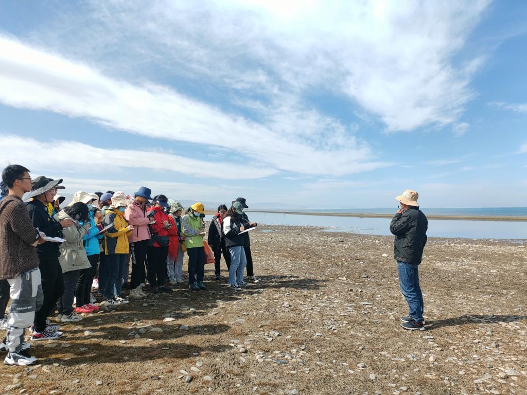 青海湖,藏语名为“措温布”(意为“青色的海”),长105公里,宽63公里,湖面海拔3196米,是中国最大的内陆湖泊,地处青藏高原的东北部,西宁市的西北部,位于东经99°36′~100°16′之间,北纬36°32′~37°15′之间。由祁连山脉的大通山、日月山与青海南山之间的断层陷落形成。程先富向同学们讲解了青海湖由淡水湖向咸水湖演变的过程,强调了气候变化与新构造运动对青海湖水文环境的影响,以及降水量与蒸发量间的不均衡关系造成的长期盐分累计。程先富以细致入微的讲解从因到果分析结构、演变以及发展,使同学们对知识的理解更加通透。