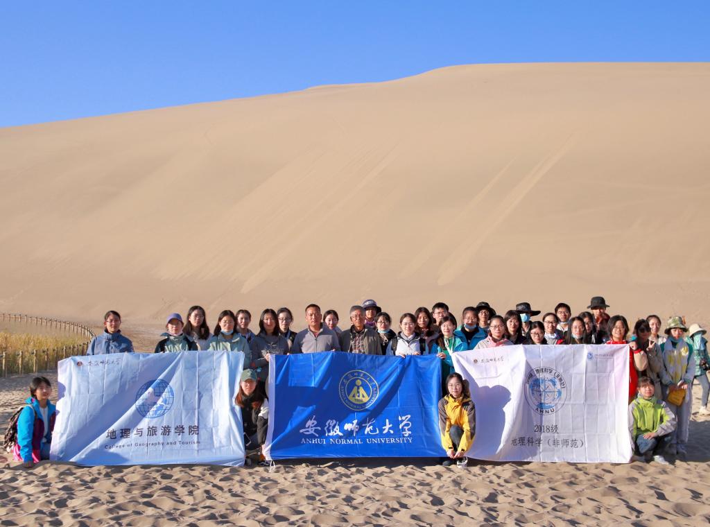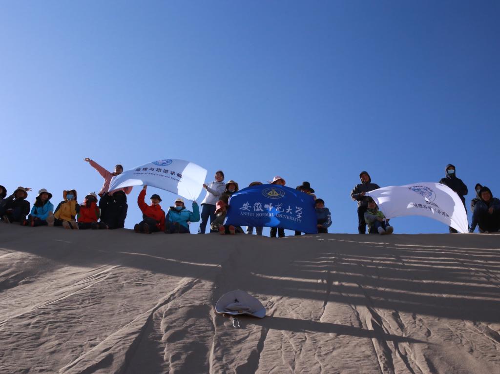 西北自然条件之恶劣只有身处当地才能体验到。烈日高照,干冷无比的风像带刺的鞭子,抽得同学们脸颊生疼,干涸的喉咙几乎发不出声音。学生们顶着寒风如饥似渴地记录笔记,手冻得通红干裂,字形扭曲得不成样却仍然不想漏掉老师讲解的每一个要点。不畏难,敢攀登,师生翻越山岗、踏足沙峰,安徽师范大学的旗帜在西北的寒风中猎猎飞扬。