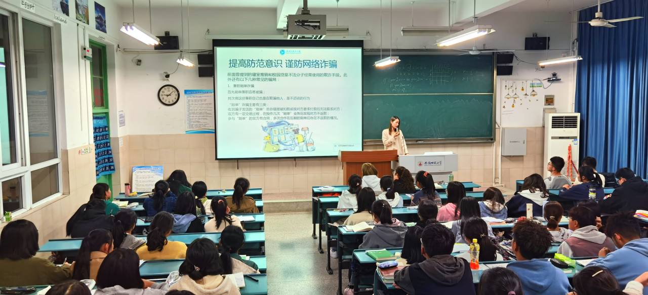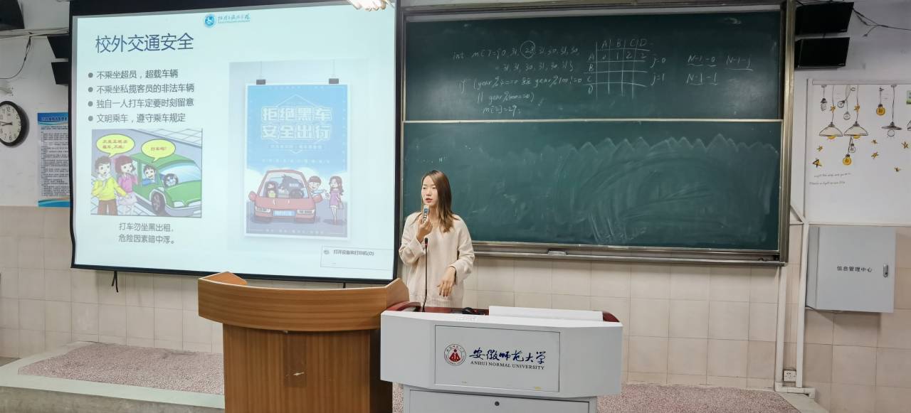 赵佳慧主要从交通安全、寝室安全、校园贷和其他安全问题四个方面对同学们进行安全知识的讲解。交通安全,包括校外安全、校内安全和步行安全三个方面,劝导同学们遵守交通规则,避免在校园内骑电力驱动车;寝室安全,包括财务安全和用电安全,强调禁止使用违规电器;校园贷,包括个人信息安全,提醒同学们注意一些校外的骗局;其他类安全问题,包括反对邪教、网络骗局、大学生心理问题和校园疫情防控等。赵佳慧就八大常见校园网络骗局展开详细的讲解,提醒同学们要提高辨别是非的能力,谨防上当受骗。