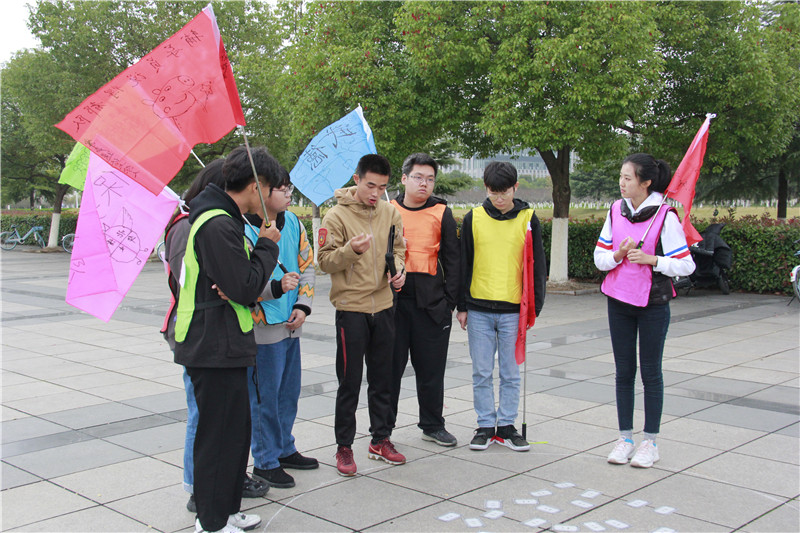 第一轮游戏结束后,同学们在教练的指导下有序地分为了六组,每组推选出队长及秘书,在队长的带领下,各小组成员共同参与,进行头脑风暴,想出本小组独具特色的队名、口号、队歌、队旗及队形。在活动中,同学们相互交流、增进了解、集思广益,将活动气氛推向了高潮。
