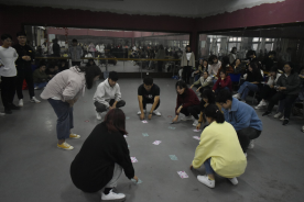 活动第三项,翻牌子大作战。猜拳两两小组对决,每小组派出四人,选择一个花色,将地上的二十张卡片全部翻成我方颜色,记时结束时花色朝上多的一组获胜。同学们两两小组对战,全都拼尽全力,场下同学热情地为他们加油鼓劲。经过车轮战,最终第四组获得了胜利,全组获得了零食奖励。失败的小组接受指压板俯卧撑惩罚。