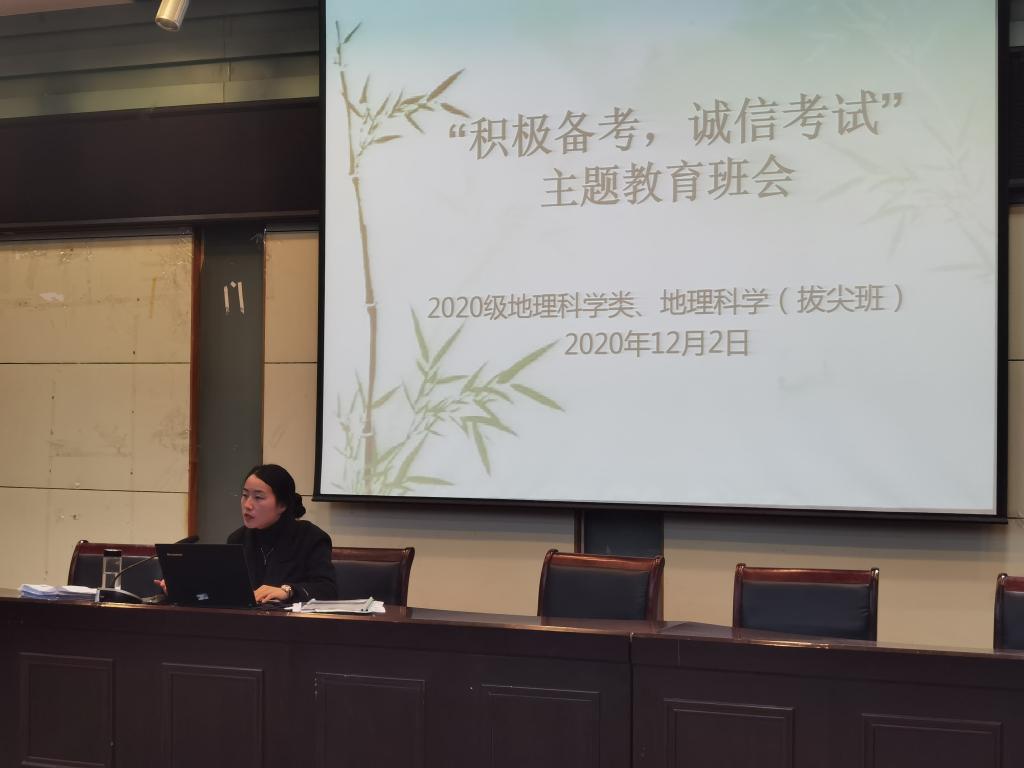 本网讯(565net必赢客户端 汪琦 彭媛媛 )期末考试复习月,为进一步强化班风学凤,提醒同学们积极迎考备考诚信考,2020年12月2日,2020级地理科学类、地理科学(拔尖班)于565net必赢客户端实验楼101会议室召开“积极备考,诚信考试”主题教育班会,565net必赢客户端2020级地理科学类和地理科学(拔尖班)全体同学参加会议。会议由辅导员彭媛媛主持。