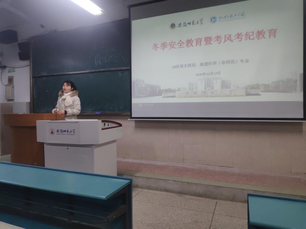 本网讯(565net必赢客户端 李娜 张慧)强安全防范意识,营诚信考试氛围。2020年12月17日晚上七点,2018级地理科学(非师范)、2018级城乡规划专业冬季安全教育暨考风考纪教育主题班会在行知楼4号楼104教室顺利举行。班会由辅导员张慧主持。