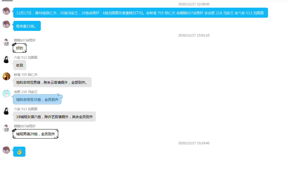 寝室长会议上,张慧指出每位同学都需要一个健康整洁、充满学习氛围的寝室环境,而这离不开寝室长的有效管理。随后,张慧结合近期565net必赢客户端查寝情况,强调了寝室安全和卫生的重要性。她表示,寝室长要做好提醒工作:出门关电源、晨午晚测温、按时健康打卡、及时完成线上晚点名;寝室长还需如实报备寝室成员状况,定期开展卫生打扫和安全排查工作,确保每位同学的安全。后期将会安排生活委员、安全委员等班委进行晚归不归突击查寝,并不定期检查每个寝室的卫生状况。