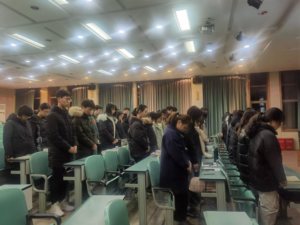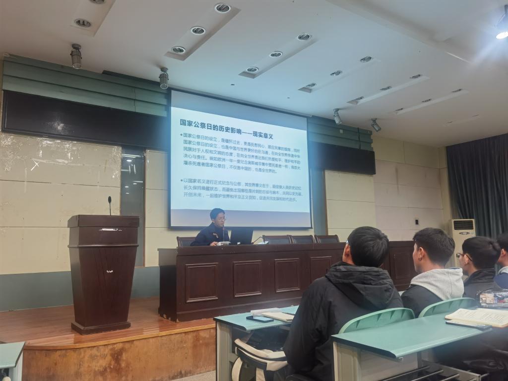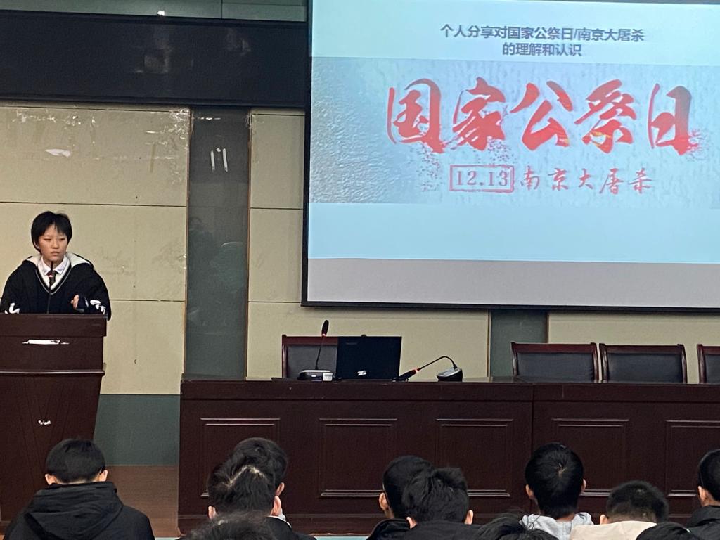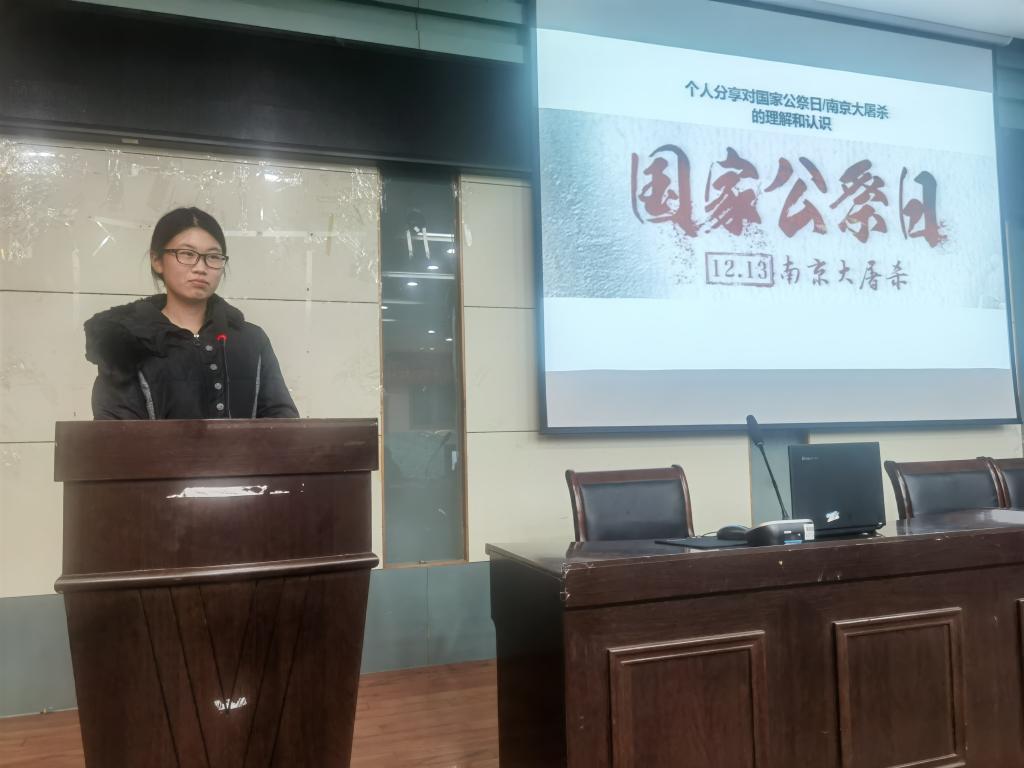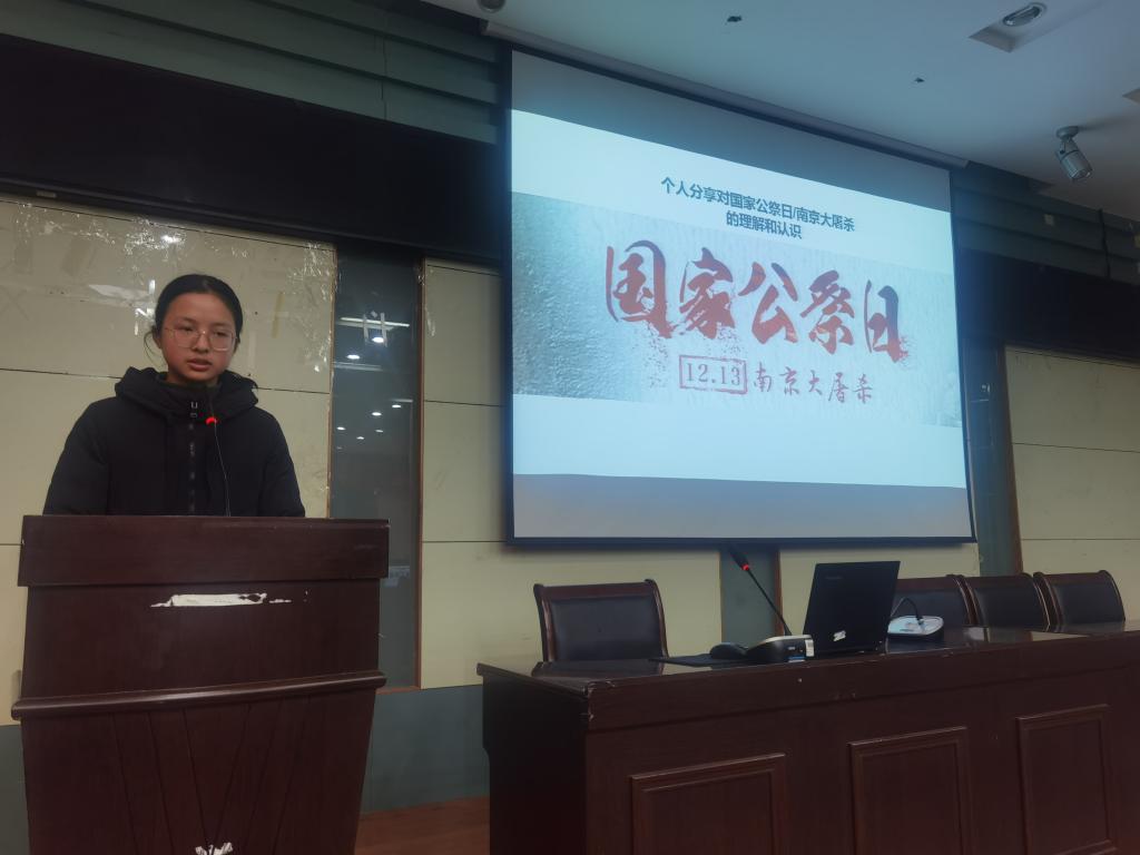 随后,由团支书孙文灿带着同学们观看了我国首个国家公祭仪式的相关视频,领着同学们一起走向那段历史,了解南京大屠杀死难者国家公祭日的由来与现实意义。2014年2月25日,中华人民共和国第十二届全国人大常委会第七次会议全票通过决定将12月13日确定为南京大屠杀死难者国家公祭日。2014年12月13日,首次南京大屠杀死难者国家公祭仪式在南京举行。设立南京大屠杀死难者国家公祭日,不仅是缅怀历史,顺应民意,提醒人民要牢记那段历史,同时也体现出中国对于人权的尊重,向世界传递出和平的信号。