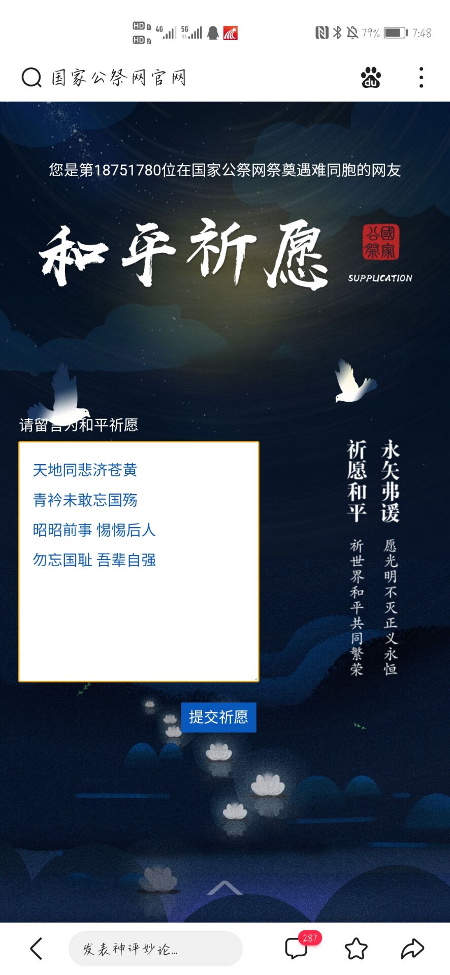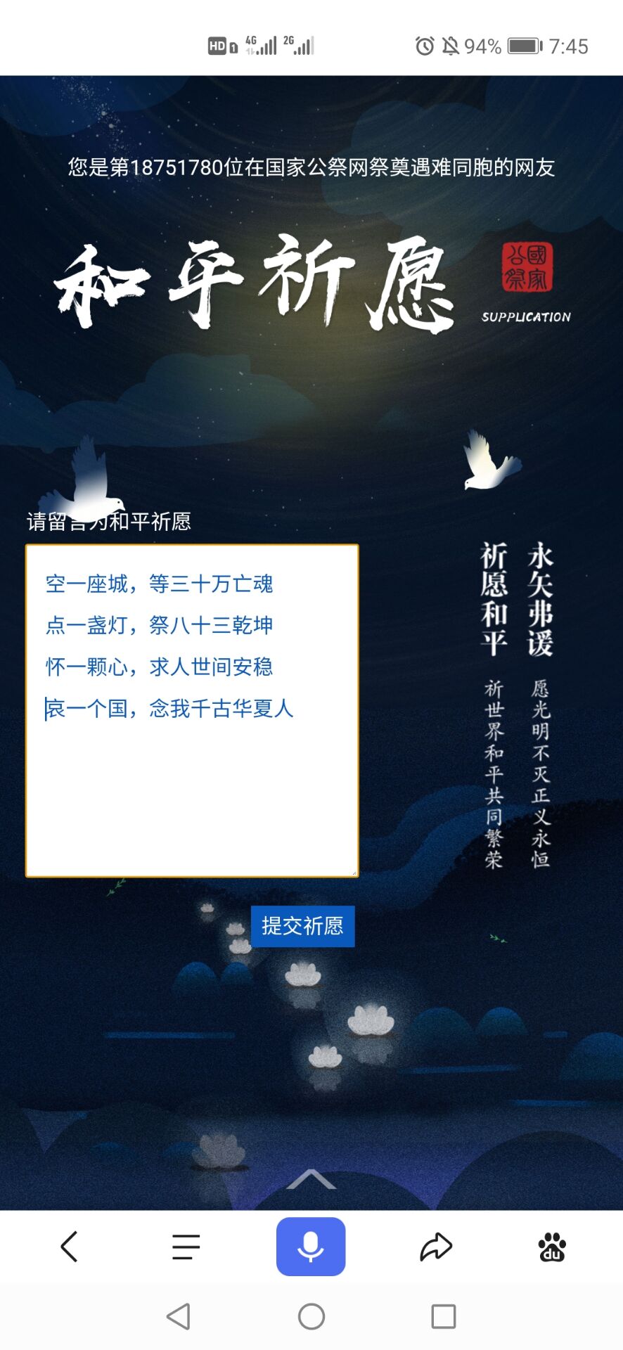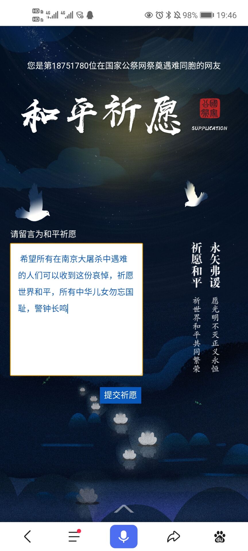 铭记历史,珍爱和平。接着,同学们一起登录国家公祭网,在线悼念那些在苦难中逝去的同胞们,为他们点一支烛,献一束花,敲一声钟,写一段话,告慰同胞,祈愿和平。同时,同学们集体起立默哀三分钟,尽管历史已然成为过去,但那些逝去的同胞却永远活在世人的心中。