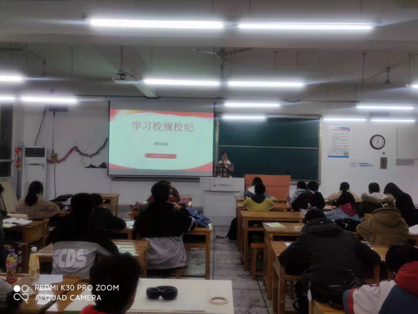 首先,徐嘉祺以提问的方式引出活动主题,通过精彩的案例以及学校对违纪同学的通报决定向各位同学强调了认真学习并严格遵守校规校纪的重要性。接着,徐嘉祺带领大家认真学习校规校级,并领读安徽师范大学学生管理“四项禁令”:严禁擅自离校、严禁私自租房、严禁晚归不归、严禁违规电器,通过竞答的方式对班级同学进行校规校级知识考核。最后,辅导员刘少杰通过讲述真实案例向大家再次强调认真学习并严格遵守国家法律法规和校规校级的必要性和重要性,并对每位同学提出要求:对于校规校级的学习不仅要内化于心,也要外化于行!