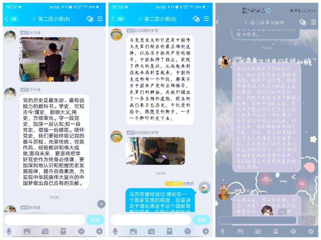 第二团小组代梦雪表示,马克思主义的引进是中国伟大先辈们做出的最正确的选择,以后在中国共产党的领导,中国取得了独立,实现了伟大的成就,从站起来到强起来再到富起来,中国所走过的每一个阶段,都离不开中国共产党的正确领导,先辈们的鲜血,为我们铺出了一条正确的道路,现在的我们要认真学习党的历史,牢记党的使命,跟随党的脚步,一步一个脚印的走下去。