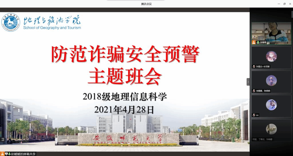 本网讯(孙雯杰 彭媛媛)为加强同学们五一假期安全思想教育,提醒防诈骗防传销相关事项,以及宣传征兵政策,2018级地理信息科学专业于2021428日晚上830在腾讯会议开展五一假期安全、防诈骗暨征兵政策网上主题班会。班会由辅导员彭媛媛主持,2018级地理信息科学专业全体同学参与。