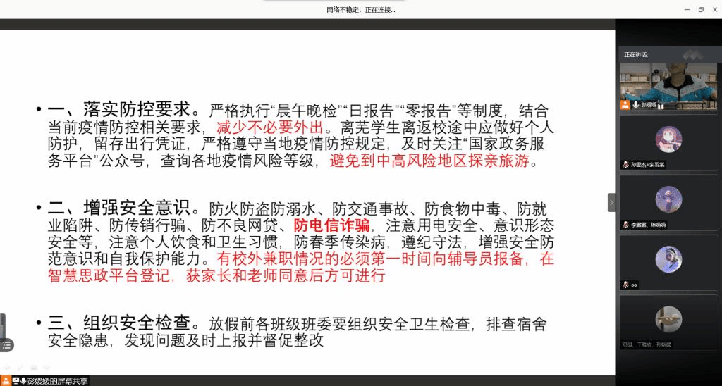 会议伊始,进入会议第一项议程:五一假期安全教育主题班会。彭媛媛针对假期安全提出五项要求,分别为:落实防控要求、增强安全意识、组织安全检查、严格登记制度、以及坚持人走断电。结合当前疫情防控相关要求,严格执行“晨午晚检”“日报告”“零报告”等制度,减少不必要外出。关于增强安全意识,彭媛媛提出同学们要“防火防盗防溺水、防交通事故、防食物中毒、防传销行骗、防电信诈骗,注意用电安全”等,同时要增强安全防范意识和自我保护能力。最后彭媛媛提醒假期离开实习地的学生要严格履行离校登记制度:今日校园请假、家长发核实短信、到家报平安、返岗及时销假。假期保持手机畅通,并坚持每日健康打卡。