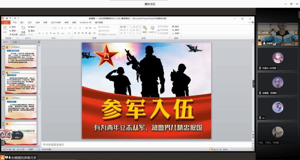接着进入会议最后一项议程:征兵政策宣讲。彭媛媛根据征兵政策相关文件向同学们讲解了相关政策,其中包括国家优待政策、芜湖市优待政策、学校优待政策以及退役后发展途径等相关信息。其中国家设立“退伍大学生士兵”转向说是研究生招生计划,在部队中荣获二等功以上的退役人员,符合研究生报名条件的可免试攻读硕士研究生。会议最后,彭媛媛鼓励同学们积极报名参军,为国家做出贡献,让携笔从戎成为新时代大学生的时尚追求。