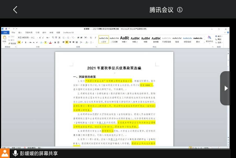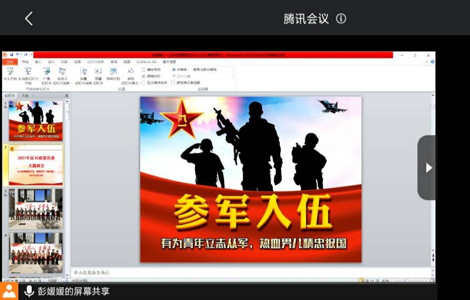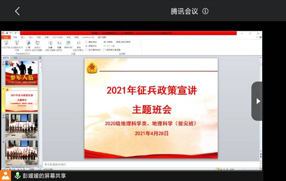 本网讯(565net必赢客户端 任家俊 彭媛媛)为加强同学们对征兵政策的了解,调动同学们参军报国的积极性,2021年4月28日,2020级地理科学类、地理科学(拔尖班)在腾讯会议平台召开征兵政策宣讲主题班会,会议由辅导员彭媛媛主持,2020级地理科学类、地理科学(拔尖班)全体学生参会。