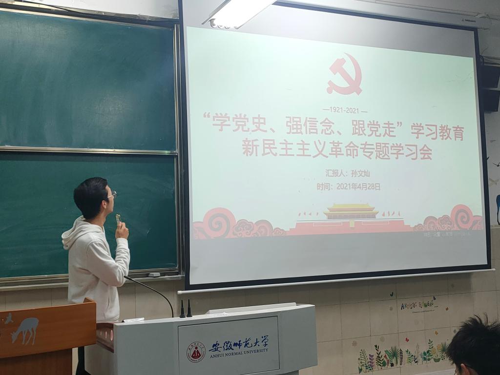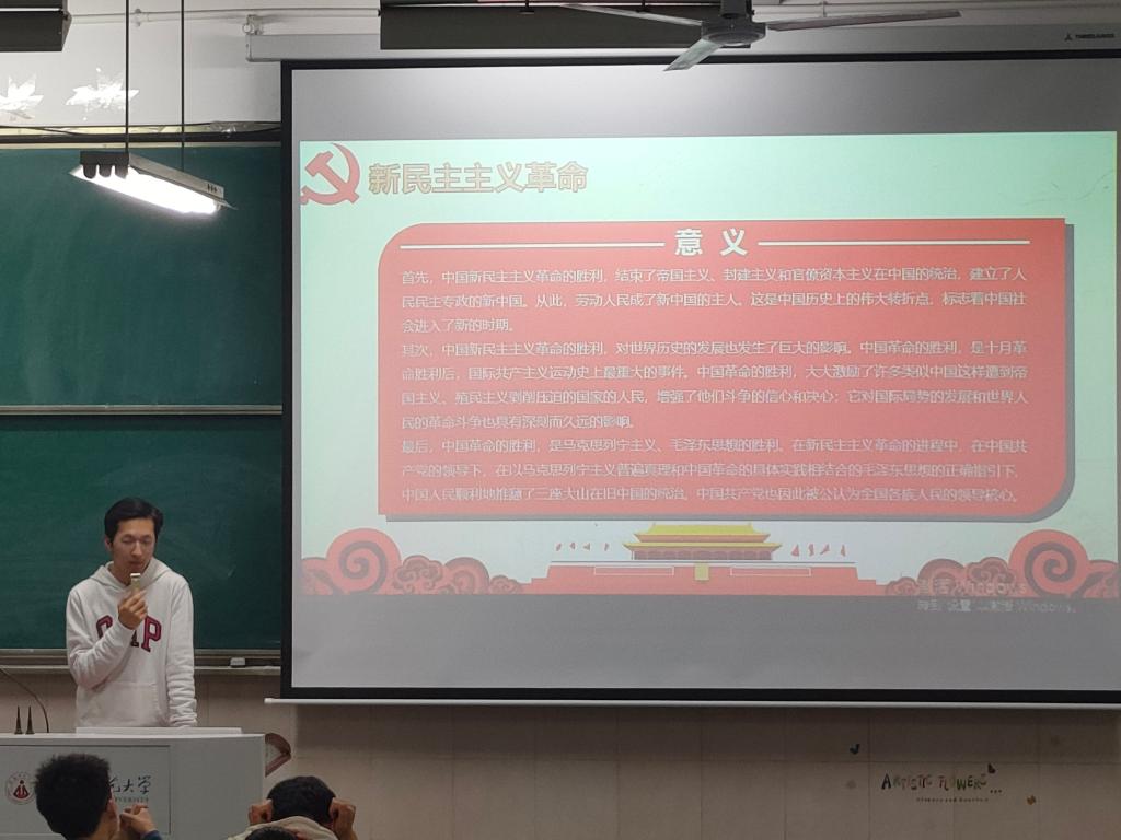 会上,孙文灿首先向大家介绍了新民主主义革命发生的时间及背景,并通过一部短片回顾了新民主主义革命的历程。此后邀请了沈艳燕、汪子韩、余艺茗三位同学与大家一起共同梳理了新民主主义革命时期发生的重大历史事件。在专题学习会的最后孙文灿强调了新民主主义革命的重要历史意义,并指出希望各位同学在会后开展党史个人学习,不断提升自身政治素养。