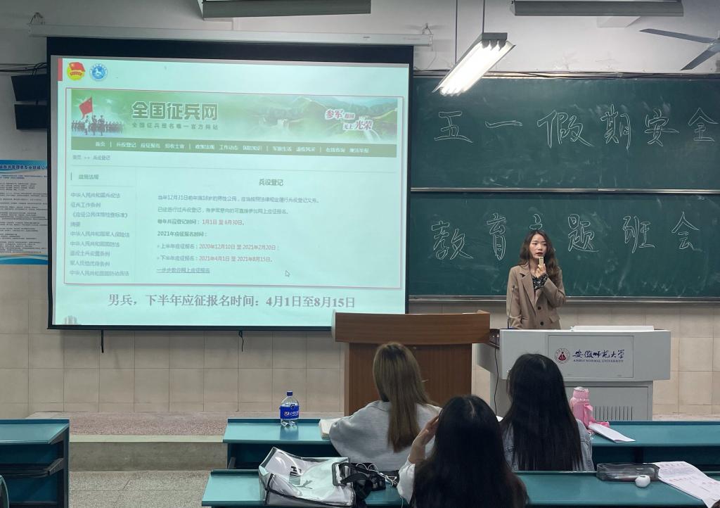 本网讯(565net必赢客户端 赵佳慧 孙云峰)投笔从戎,报效祖国。为加强同学们对国家征兵入伍优惠政策的了解,鼓励同学们积极报名入伍,同时增强同学们的爱国信念,4月28日晚,2020级旅游管理专业于行知楼4号楼203教室召开以“参军入伍 无上光荣”为主题的班会,班会由20级旅游管理专业辅导员赵佳慧主持,20级旅游管理的全体同学们参与了此次班会。