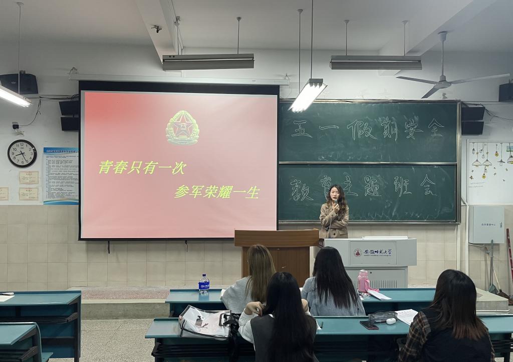 班会一开始,赵佳慧向同学们介绍大学生应征入伍的优惠政策,除家庭按规定享受军属待遇外,还享受优先选拔使用、学费补偿和国家助学贷款代偿、退役后考学升学优惠、就业服务等政策,鼓励同学们积极应征入伍。同时,赵佳慧强调大学生优先征集入伍,学校对入伍的同学保留两年的学籍,对于之后的考研、考公也有一定帮助。班会中途,赵佳慧为同学们放映了两段关于国家入伍士兵的小视频,视频弘扬了参军报国的正能量,让同学们充分了解了大学生入伍的重要意义。班会的最后,赵佳慧还介绍了大学生入伍的流程及相关的注意事项,包括宣传报名、体检政考、定兵入伍等具体的流程。