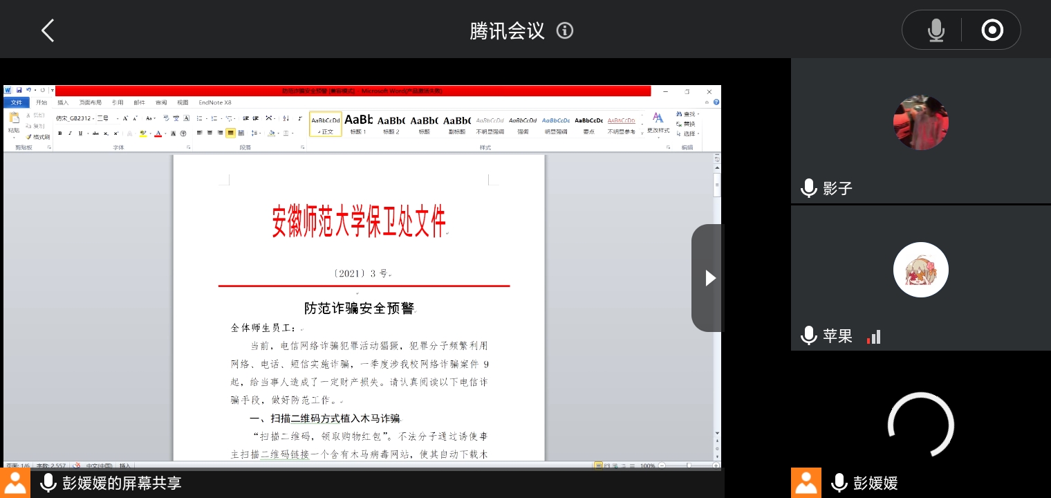 此外,彭媛媛带领同学们系统学习了安徽师范大学保卫处文件《防范诈骗安全预警》,如通过二维码、链接植入病毒,通过“网上购物退款”、“机票改签、航班取消”等实施诈骗,通过淘宝刷钻、刷信誉等兼职诈骗,网络虚假投资诈骗等,另外从警方的渠道可知,若要求先支付,交纳保证金、稿费、押金100%为虚假招聘,切勿上当受骗。必要时请立即与警方联系。时代变化之快,诈骗传销手段层出不穷,并且更加难以识破,同学们一定要提高警惕性。