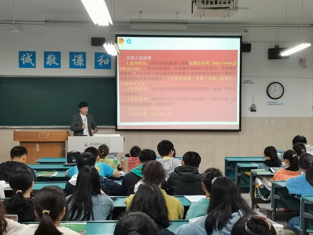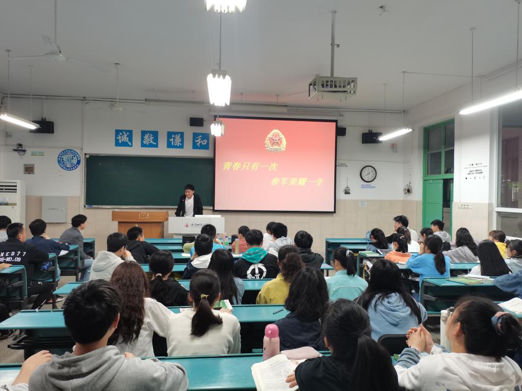 首先辅导员刘少杰给大家分别介绍了2021年下半年男兵和女兵的报名时间节点、应征入伍的流程和相关注意事项以及征兵的意义及相关优惠政策。接着刘少杰向大家介绍了我国优秀青年军人的典型事例以及我们身边的优秀大学生军人代表,鼓励同学们向榜样看齐,积极投身到军营,报效国家。刘少杰说到,大家一定要树牢爱国意识,坚定理想信念,要珍惜现在的学习生活条件,要时刻牢记是党和国家给我们创造了这么好的学习生活条件,我们需要做什么来报答党和国家。最后,班内退役军人王宏志向大家分享了在部队服役两年的收获和感受,并动员大家积极主动投身到军营中去,实现人生的理想价值;即将报名入伍的优秀学生代表王令帅给大家分享了自己想要入伍的初心以及坚定的信念,他说,好男儿就应该走到军营去!