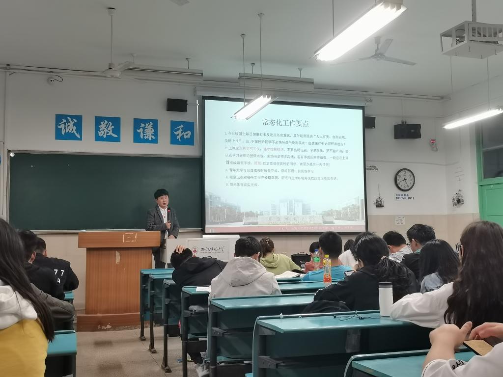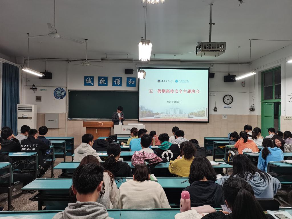 首先,刘少杰给大家介绍了2021年国际劳动节放假的安排,特别提醒大家做好假期的行程安排。然后,刘少杰向大家明确假期离校需要办理的请假手续及流程,并特别强调:五一劳动节离校,首先需要征得家长的同意,要求家长给辅导员发短信确认后,在今日校园上进行请假,同时完成离校安全承诺书、假期离校登记表以及智慧思政中的离返校申请的填写;往返途中实时告知辅导员自己的动向,到家后,给辅导员发短信报平安;如有特殊情况需及时与辅导员沟通交流,返校后及时在今日校园上销假。接着,刘少杰向大家强调了常态化工作要点,例如,常态化疫情防控的工作不能放松,今日校园上每日健康打卡及晚点名应重视,晨午晚检工作要坚持,如实做到“自测自填、及时上报”。做好个人防护工作,注意保护自己的人身和财产安全。做到“人物同防”、勤洗手、勤通风、戴好口罩再出门。贵重物品随身带,陌生搭讪、推销不理睬。在校学生严格执行出校门请假制度,“四项禁令”必须严格遵守等等。最后,辅导员刘少杰祝愿大家度过一个充实而愉快的五一假期。