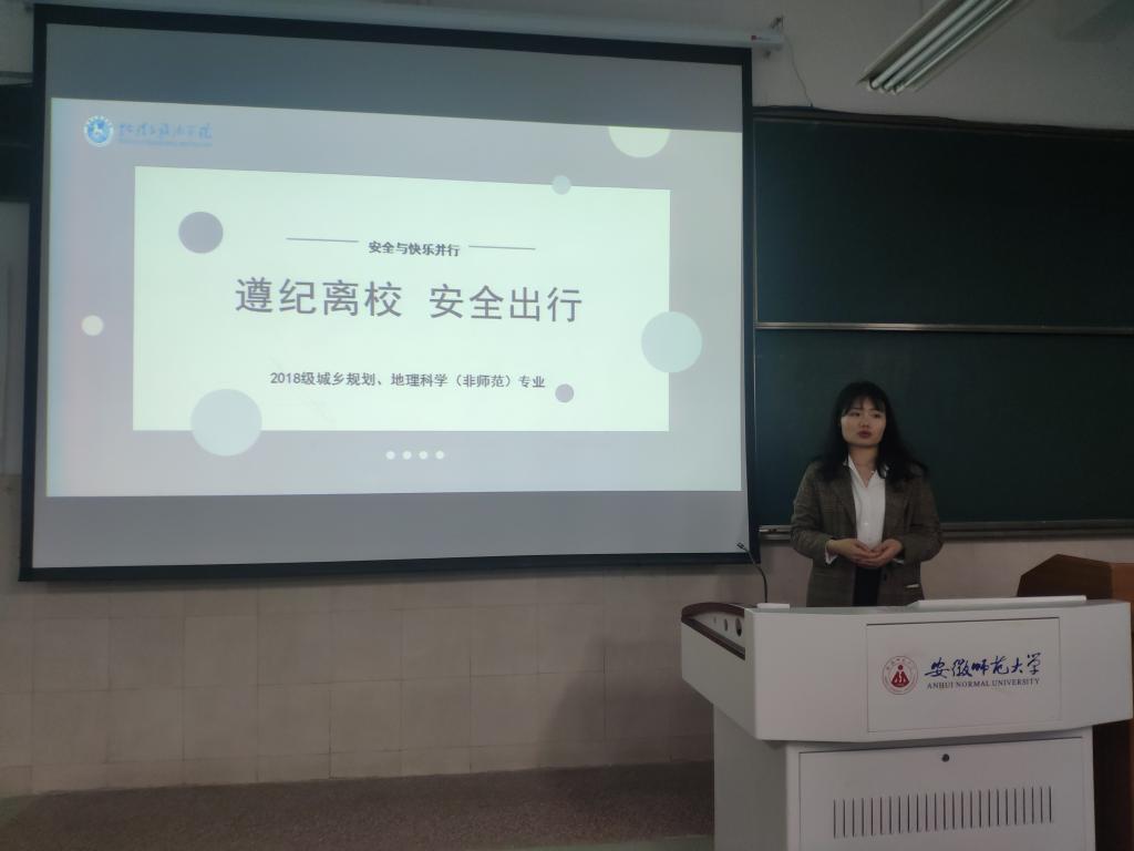 本网讯(565net必赢客户端 潘爽)为增强学生假期安全意识,加强安全文明校园建设。2021年4月28日晚,565net必赢客户端2018级城乡规划专业及2018级地理科学(非师范)专业于行知楼4号楼301开展“遵纪离校 安全出行”主题班会。会议由辅导员张慧主持,2018级城乡规划专业与2018级地理科学(非师范)专业全体同学参与。