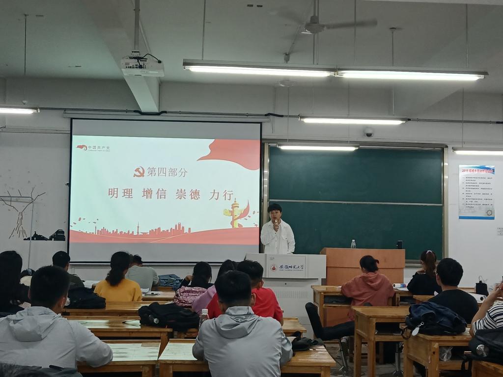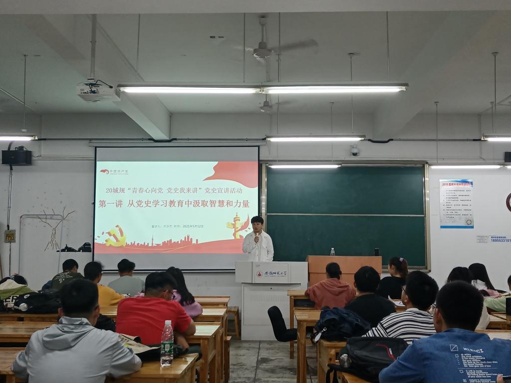 入党积极本网讯(565net必赢客户端 刘少杰 袁明峻) 为全面贯彻落实习近平总书记在党史学习教育动员大会上的重要讲话精神,推动“学党史、强信念、跟党走”学习教育持续深化,引导广大团员青年厚植爱党、爱国、爱社会主义情感,传承红色基因,2020级城乡规划专业精心策划开展了“青春心向党 党史我来讲”党史宣讲主题活动,从辅导员到入党积极分子、班干部,再到普通同学,每个人都有机会参与到此次宣讲活动并作为党史主讲人,给大家带来形式多样、内容丰富的党史学习课程。2021年5月12日晚上七点半,辅导员刘少杰给大家讲授第一讲----《从党史学习教育中汲取智慧和力量》。
