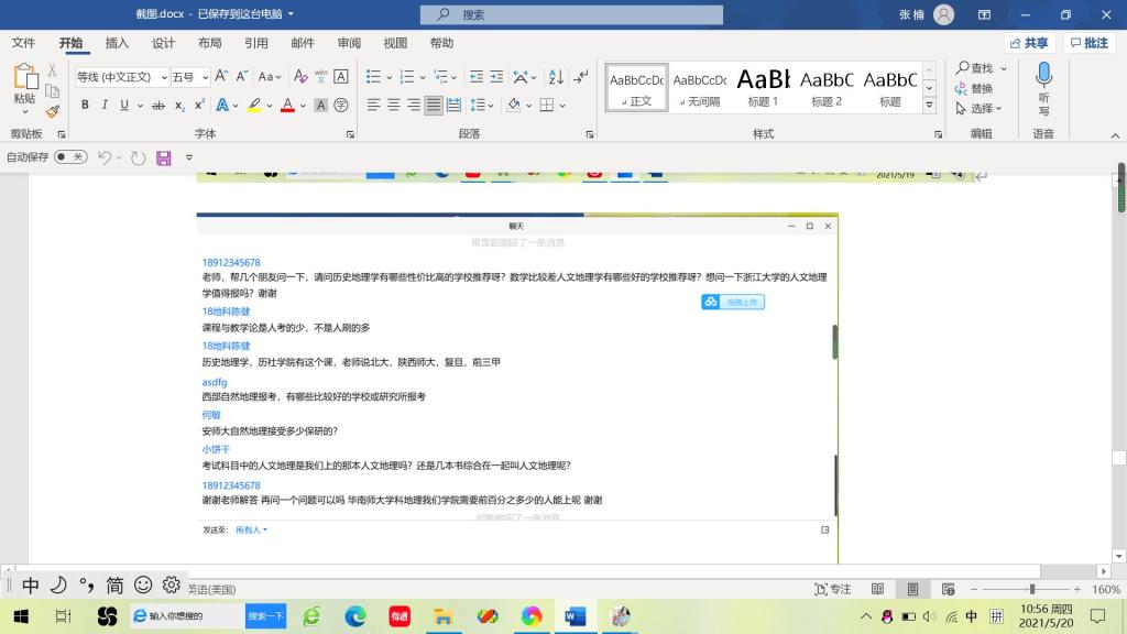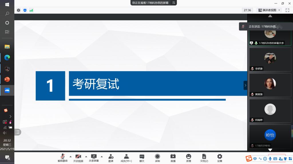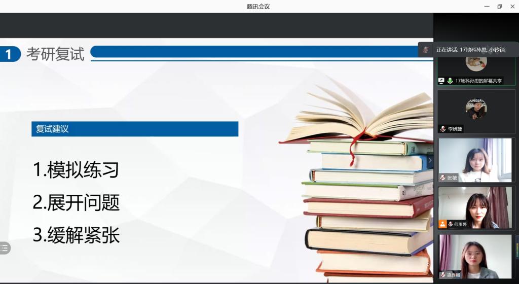 本网讯(565net必赢客户端 丁茹栩)为充分调动准备考研学生的积极性,明确同学们的考研目标,帮助考研学子答疑解惑,5月19日,565net必赢客户端于线上开展了地理科学专业考研经验交流分享会。出席本次经验交流会的成员主要有地理科学专业负责人朱永恒教授、地理系专业教师孙鹏、吴立、胡春生、汪青、张平究、刘学梅老师、辅导员丁茹栩、2017级地科考研学生代表和2018级地科全体考研学生,会议由张瑞清同学主持。