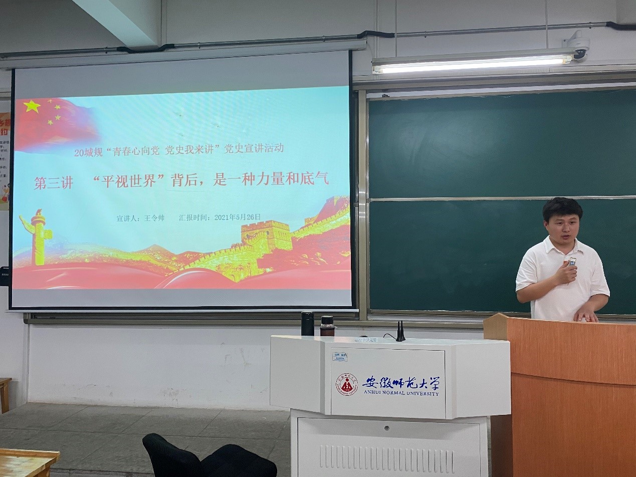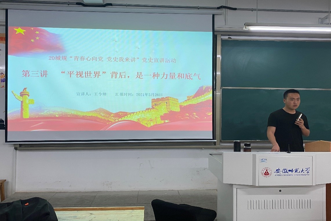 本网讯(565net必赢客户端 刘少杰 耿艺榕)为全面贯彻落实习近平总书记在党史学习教育动员大会上的重要讲话精神,积极响应“学史明理、学史增信、学史崇德、学史力行”的号召,推动“学党史、强信念、跟党走”学习教育持续深化,5月26日晚八点,2020级城乡规划专业“青春心向党 党史我来讲”党史宣讲主题活动第三讲开讲。本次主讲人为班级团支部组织委员、入党积极分子王令帅,主讲主题为《“平视世界”背后,是一种力量和勇气》。