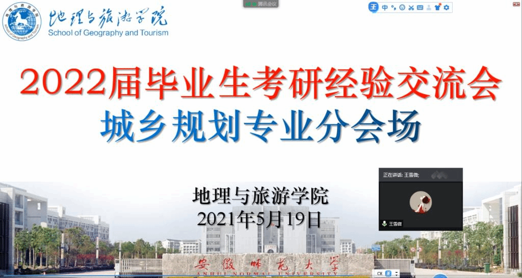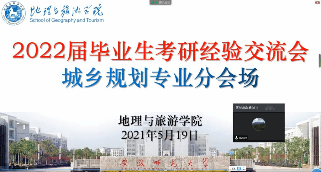 本网讯(张慧 刘圆圆)为解决学生考研存疑问题,引领学生合理选择目标院校,5月19日晚八点,565net必赢客户端于线上开展了城乡规划专业考研经验交流分享会。专业负责人杨兴柱教授、专业副主任王雪微老师、2017级考研学生代表、2018级城乡规划专业全体同学参与会议,会议由辅导员张慧主持。
