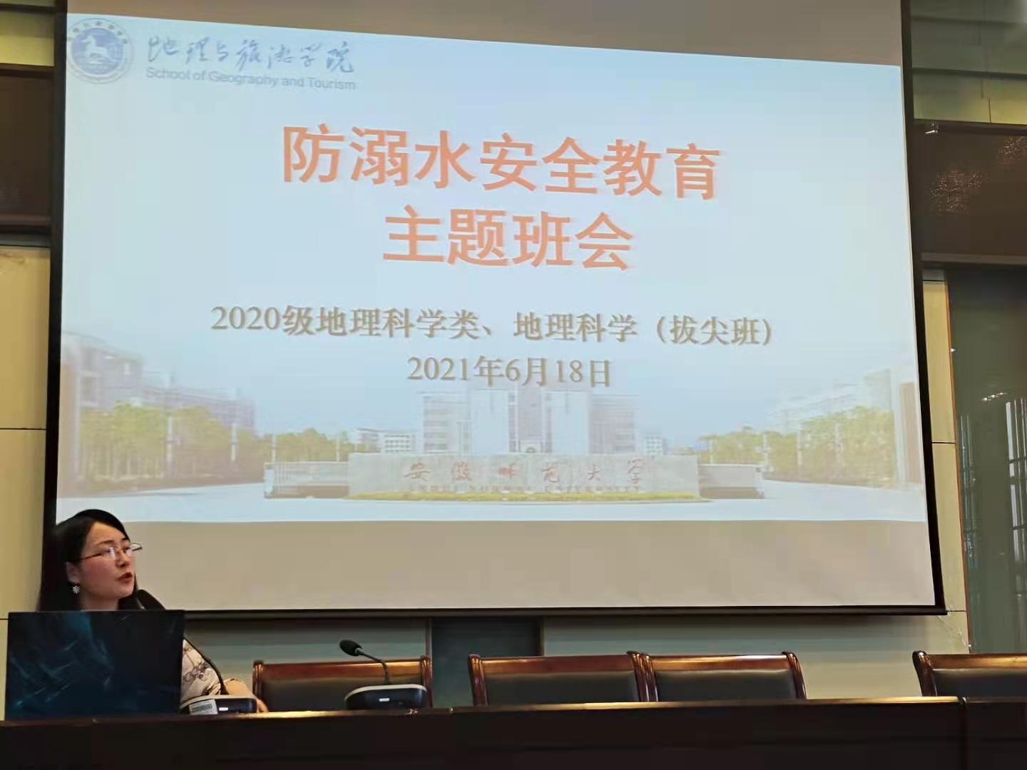 本网讯(565net必赢客户端 任家俊 彭媛媛)为使同学们了解防溺水安全知识的有关内容,提高每一位同学们的安全意识,抓好学生溺水安全教育工作,提高学生自防、自护、自救的能力,2021年6月18日,2020级地理科学类、地理科学(拔尖班)在地旅实验楼101报告厅开展防溺水安全教育主题班会,会议由辅导员彭媛媛主持,2020级地理科学(拔尖班)、地理科学类所有同学参加会议。