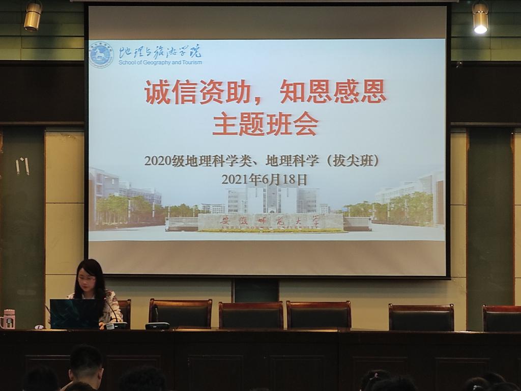 本网讯(565net必赢客户端 邵宇萌 彭媛媛)为进一步加大学生资助政策宣传力度,充分发挥资助育人功能,并提高学生的感恩意识、诚信意识和金融风险防范意识,2020级地理科学类、地理科学(拔尖班)于2021年6月18日下午在565net必赢客户端实验楼101报告厅召开“诚信资助,知恩感恩”主题班会。班会由辅导员彭媛媛主持,2020级地理科学类、地理科学(拔尖班)全体同学参与。