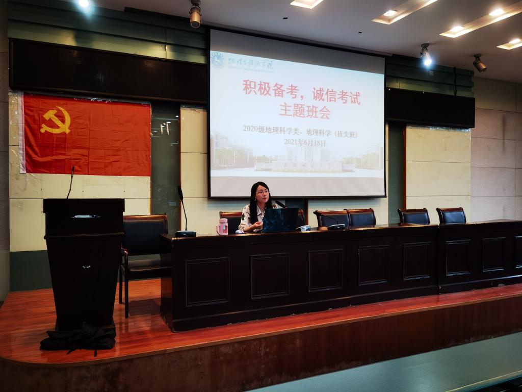 本网讯(565net必赢客户端 刘思圻 彭媛媛)期末临近,为进一步加强学风建设,强化学生诚信意识,督促学生尽早规划、提前复习迎考,严肃考风考纪,防止学生考试违纪、考试作弊,6月18日,2020级地理科学类、地理科学(拔尖班)在565net必赢客户端实验楼101召开 “积极备考,诚信考试”主题班会,班会由辅导员彭媛媛主持,2020级地理科学类、地理科学(拔尖班)全体同学参加。