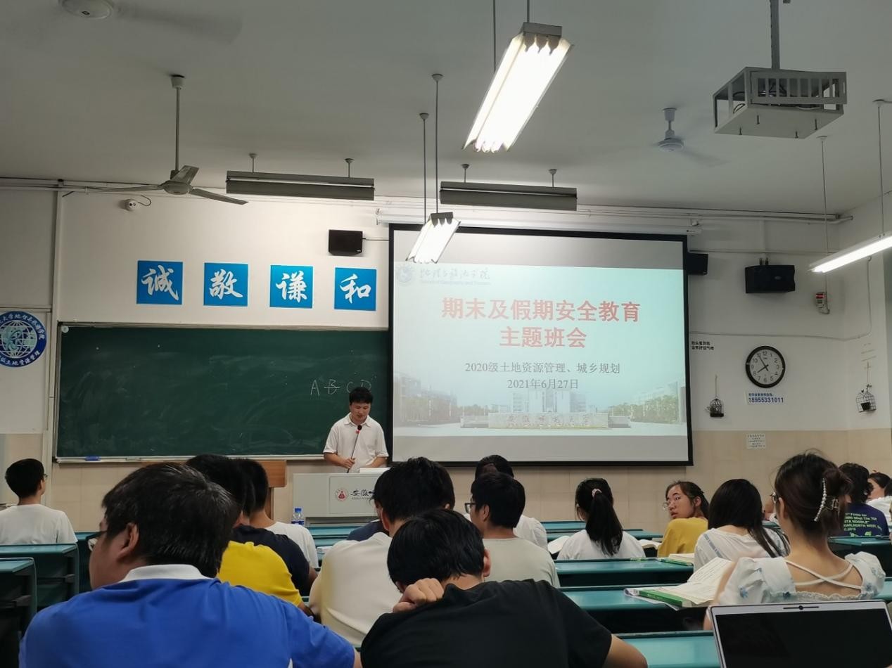 本网讯(565net必赢客户端 刘少杰 陆峻然)为增强同学们的安全防范意识,提高同学们的安全防范能力,565net必赢客户端2020级城乡规划、20级土地资源管理于2021年6月27日晚上在行知楼开展期末及假期安全教育主题班会,会议由辅导员刘少杰主持, 2020级城乡规划、20级土地资源管理全体学生参与。
