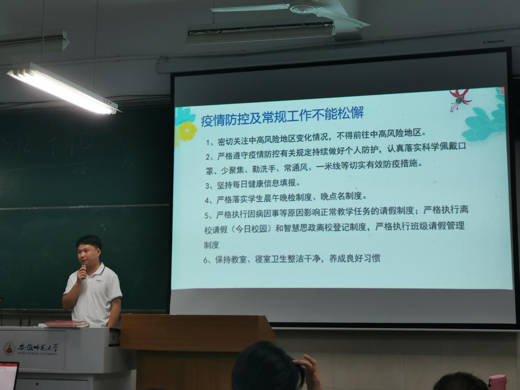 最后,刘少杰着重强调疫情防控工作要点,提醒同学们严格遵守疫情防控有关规定持续做好个人防控,认真落实科学佩戴口罩、少聚集、勤洗手、常通风、一米线等切实有效防护措施;严格落实每日健康信息填报、严格落实晨午晚检制度和晚点名制度;同时养成良好习惯,落实劳动教育实践,时刻保持宿舍和教室干净整洁。