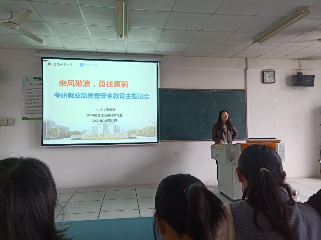本网讯(孙雯杰 彭媛媛)为做好考研学子压力疏导及安全教育, 2018级地理信息科学专业于2021年10月21日下午在565net必赢客户端实验楼201开展考研就业动员暨安全教育主题班会,会议由辅导员彭媛媛主持,2018级地理信息科学专业全体学生参与。